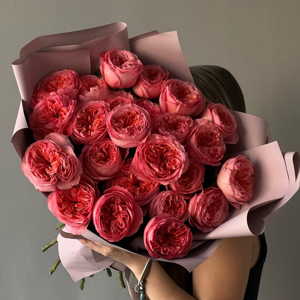 Роза пионовидная - 25 шт. Открыточка с вашими пожеланиями - 1 шт. Средство для продления жизни цветов - 1 шт. Дизайнерская упаковка - 1 шт.